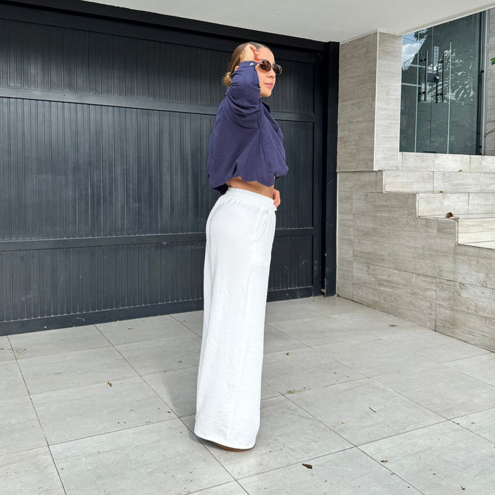 Pantalón de silueta amplia, confeccionado en una mezcla premium de algodón y lino, que garantiza una textura suave, fresca y cómoda. Este diseño incorpora bolsillos laterales prácticos y un cordón ajustable en la cintura, ofreciendo un ajuste personalizado y un toque de elegancia casual. Ideal para cualquier ocasión, combina estilo y confort en una prenda imprescindible.