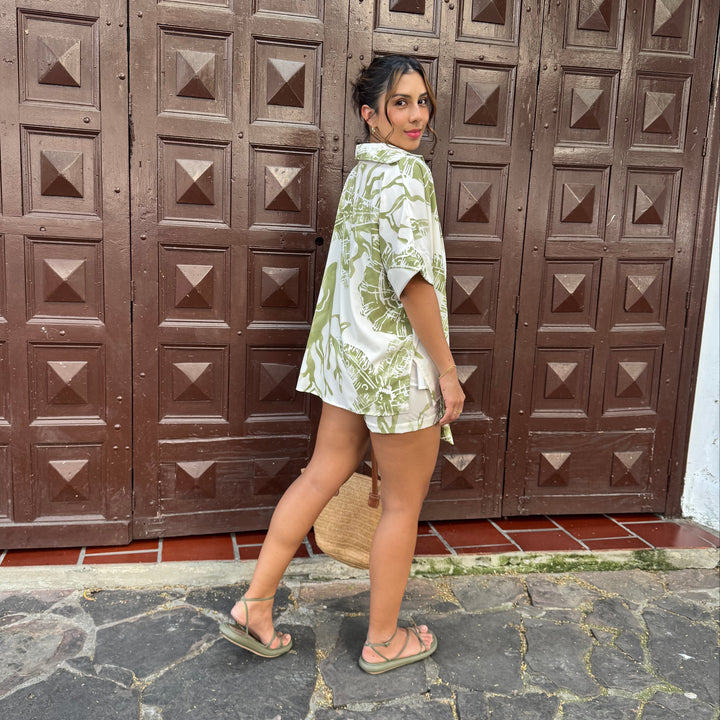 Un set moderno y femenino en seda. Falda short con silueta amplia y cierre lateral en la pretina con caucho en la parte trasera. La camisa oversize de cuello camisero y manga corta complementa este look con estilo. Una elección perfecta para toda ocasión.