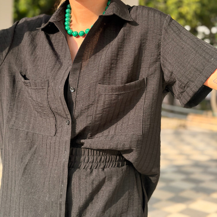 Descubre el Set Solei Negro, la combinación perfecta para esos días donde el calor y la comodidad son prioridad. Confeccionado en rayón con un acabado textil que simula bordado artesanal, este conjunto te envuelve en frescura. El short presenta pretina elástica, cordón regulable y bolsillos laterales prácticos, mientras que la camisa de manga corta con cuello clásico y cierre de botones completa tu estilo sin esfuerzo. Diseñado para quienes buscan libertad de movimiento sin sacrificar elegancia, es tu aliado ideal para cualquier momento casual donde quieras verte bien y sentirte cómodo.